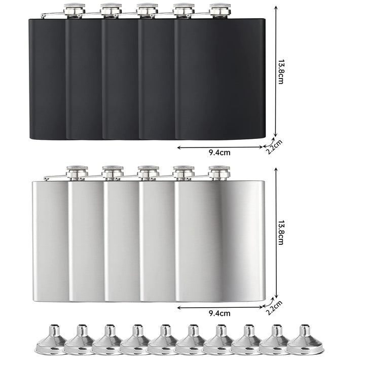1. Excelente relación calidad-precio: El paquete incluye un juego de 10 petacas de acero inoxidable de 237 ml y 10 embudos de acero inoxidable gratis. 5 colores de acero inoxidable + 5 en negro mate, la combinación de Sr. y Sra.