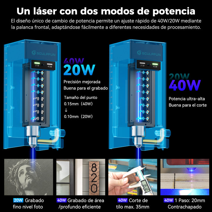 Admite conmutación de potencia láser de 40 W y 20 W, lo que proporciona un control sin esfuerzo tanto al cortar como al grabar.