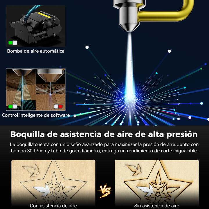 Con una manguera de aire mejorada de gran diámetro interior y un diseño optimizado de flujo de aire, la bomba de aire se conecta directamente al cabezal láser sin adaptadores, con amplio espacio de flexión para reducir la resistencia del aire. En comparación con otras máquinas, esta ofrece resultados de corte más limpios y refinados. Cuando la máquina está inactiva, se libera una pequeña cantidad de aire protector para evitar la contaminación de la lente, lo que prolonga su vida útil.