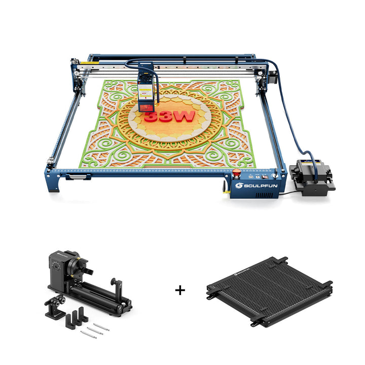 Grabador láser SCULPFUN S30 Ultra de 33 W + rodillo y mandril RA Pro Max + panel de nido de abeja H3 de 60 x 60 cm