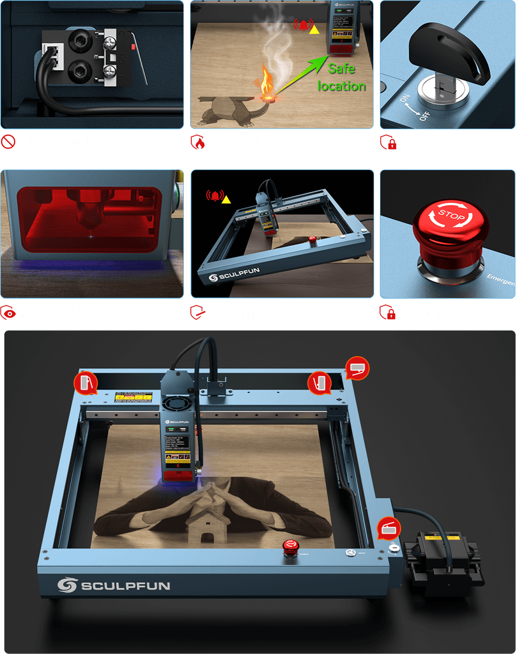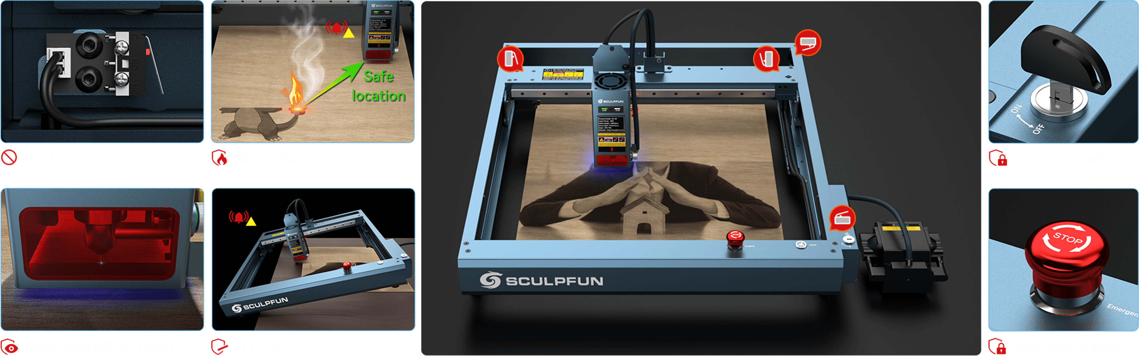 2. Diseño de seguridad: Incorpora un sensor de inclinación que activa una alarma y deja de emitir luz láser si la máquina se desequilibra y se inclina más de 15°. También está equipada con interruptores de parada de emergencia, bloqueo de seguridad para niños y sensor de temperatura de la llama. Al detectar llamas durante el proceso de trabajo, el sensor de temperatura de la llama se activa y la máquina detiene su funcionamiento con una alarma, moviéndose automáticamente a la ubicación más segura.