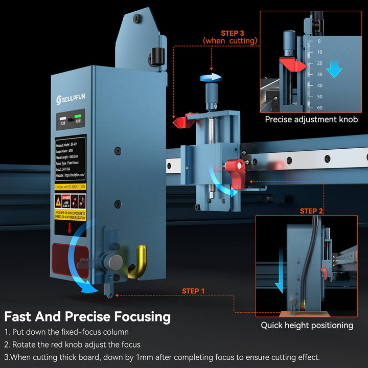 4. Diseño de enfoque preciso: Diseñada con un enfoque de máxima precisión, la palanca de enfoque del cabezal láser es estable, lo que permite una posición de enfoque más precisa. La perilla roja a la derecha del láser permite subir o bajar el módulo láser para ajustar la altura rápidamente según el grosor del material, y la perilla en la parte superior permite un ajuste preciso.