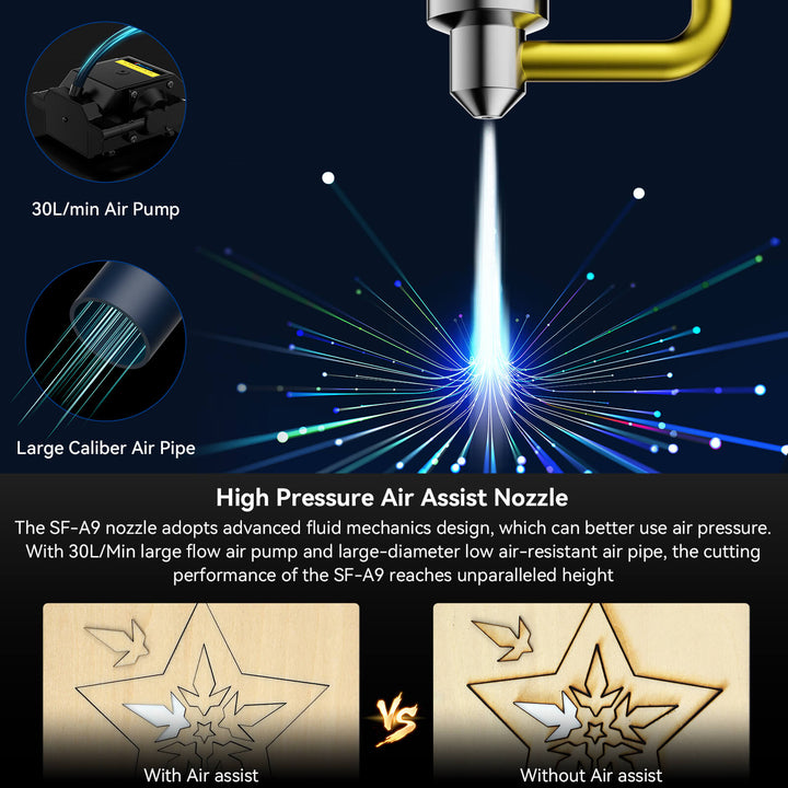 7. Asistencia de aire automática: Tubo de aire de gran diámetro interior mejorado con un diseño de canal de aire mejorado que ofrece un corte más limpio y prolonga la vida útil de la lente láser.