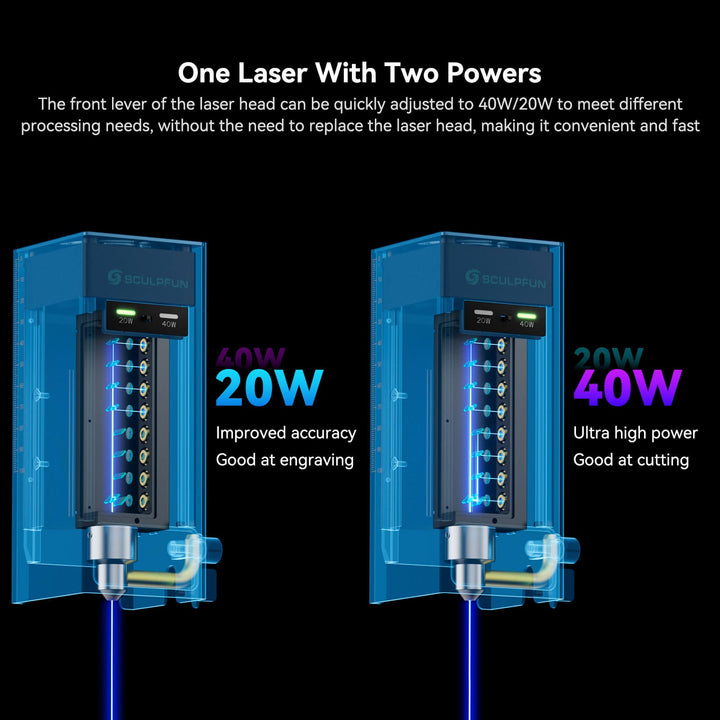 1. Láser de 40 W: La Sculpfun SF-A9 incorpora un cabezal láser de 40 W con una potente capacidad de corte y permite alternar entre 40 W y 20 W de potencia, lo que permite cortar madera contrachapada de 20 mm y acrílico oscuro de 6 mm en una sola pasada. Utiliza un radiador de tubo de calor para una disipación de calor más rápida y equilibrada.